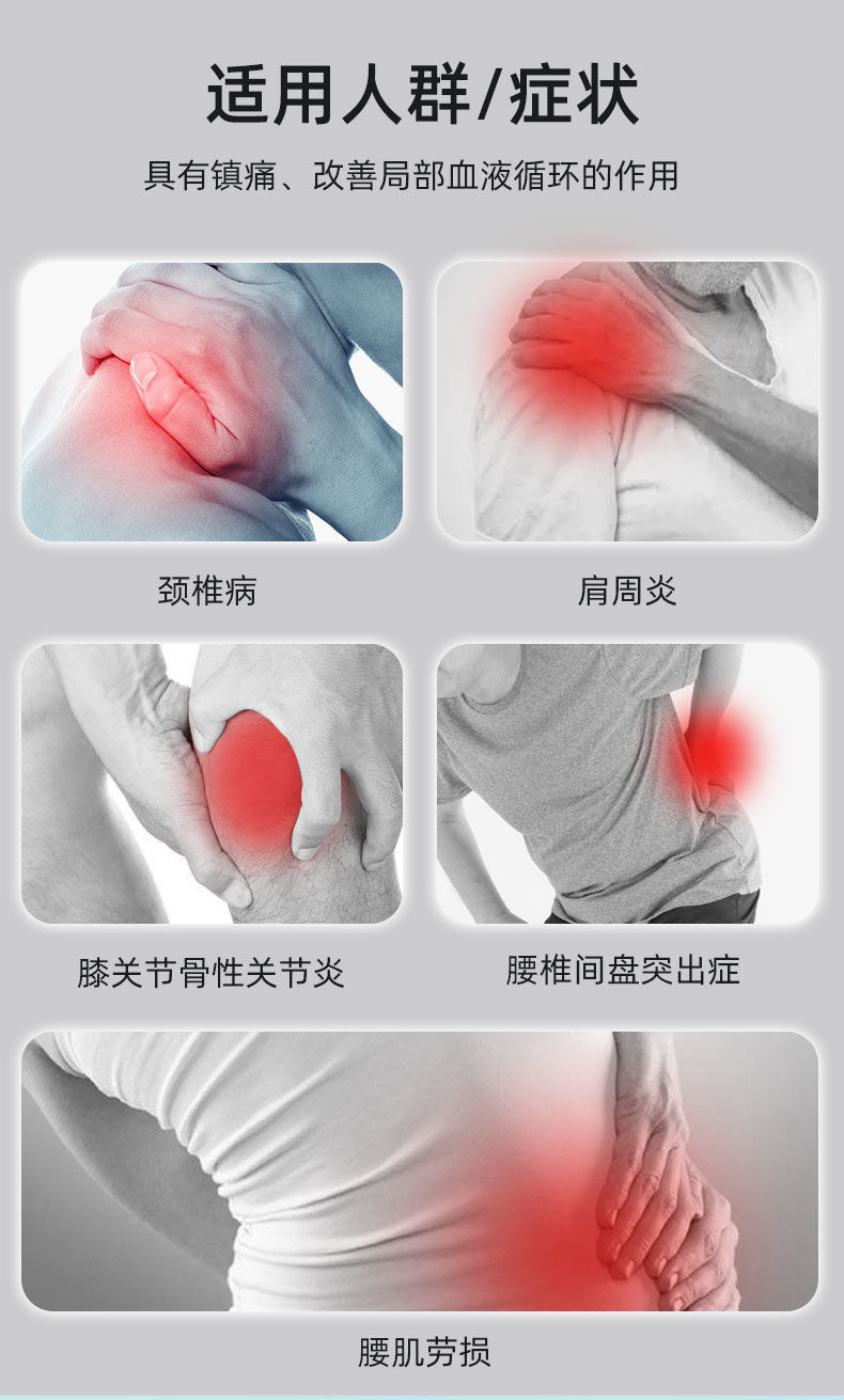 適用范圍:本產(chǎn)品適用于頸椎病、肩周炎、膝關(guān)節骨性關(guān)節炎、腰椎間盤(pán)突出癥、腰肌勞損等引起的疼痛;具有鎮痛、改善局部血液循環(huán)的作用。