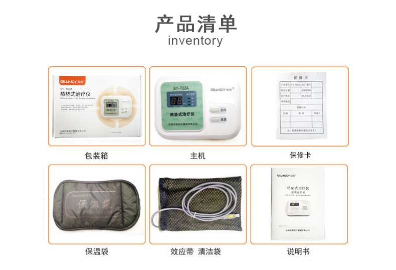 熱墊式治療儀由主機和治療帶(包括效應帶、清潔袋和保溫帶)組成。